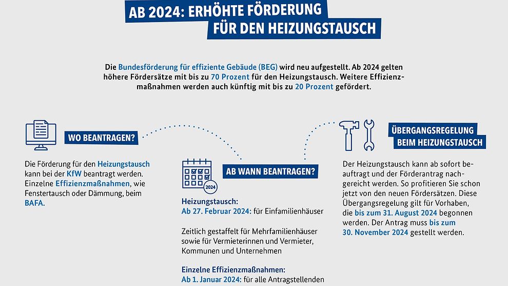 Seit dem 1. Januar 2024 dürfen in Neubauten innerhalb von Neubaugebieten nur noch Heizungen installiert werden, die auf 65 Prozent Erneuerbaren Energien basieren. Für bestehende Gebäude und Neubauten, die in Baulücken errichtet werden, sind längere Übergangsfristen vorgesehen. Dies soll eine bessere Abstimmung der Investitionsentscheidung auf die örtliche Wärmeplanung ermöglichen.